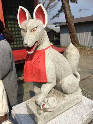 After lots of play time, we found a little Inari shrine nearby to visit. Last time in Japan, when we visited Kyoto with Momo, Hiroko, & the kids (with one less kid :) we went to the Fushimi Inari Taisho Shrine, which is the head of all the hundreds of Inari shrines in Japan. Inari is the goddess of agriculture, which has been expanded to include business in modern times. Inari's guardian messengers are Kitsune, folk-tale fox spirits, so there are always statues of kitsune at Inari shrines (that's a pretty good clue to figuring out which god is in residence, as many have favored guardians).